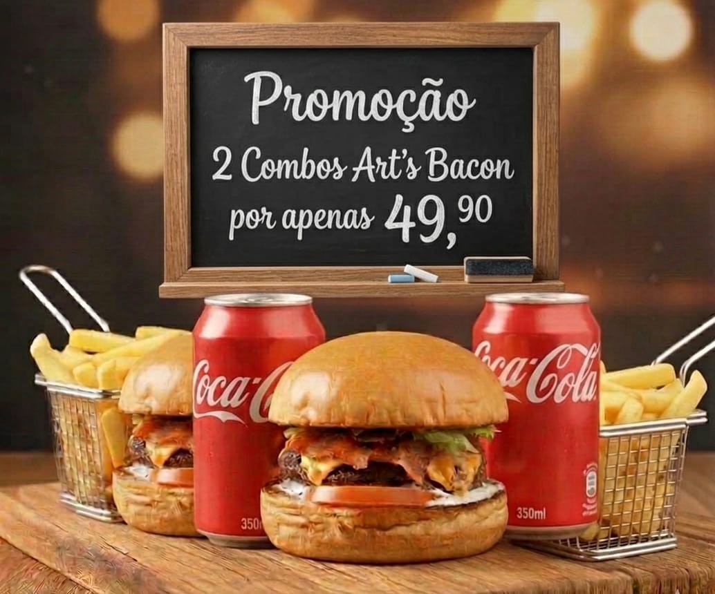 Art's Bacon: Prepare-se para a perfeição! 150g de carne bovina suculenta, grelhada no ponto certo, coberta com dois queijos cheddar derretido de dar água na boca. Tudo isso abraçado por um pão brioche amanteigado e selado, bacon crocante, salada fresquinha (alface americana, tomate e cebola roxa) e nossa exclusiva maionese de alho artesanal. Uma verdadeira obra-prima do sabor! Acompanha 30g de Maionese Artesanal de Alho Tradicional + Batata Frita 100g (Foto: Batata meramente ilustrativa) + Refri Lata 350ml.