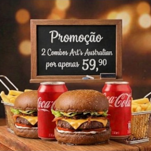 O Magnífico Art´s Australian - Uma verdadeira festa de sabores! Suculento hambúrguer artesanal de 150g, selado no pão australiano tostado com manteiga. Coberto por duplo cheddar derretido, cebola caramelizada artesanalmente, dupla fatia de bacon crocante, alface americana fresca e tomate. Finalizado com nossa maionese artesanal de alho tradicional. Uma mordida, um vício. Acompanha 30g de Maionese Artesanal de Alho Tradicional + Batata Frita 100g (Foto: Batata meramente ilustrativa) + Refri Lata 350ml.