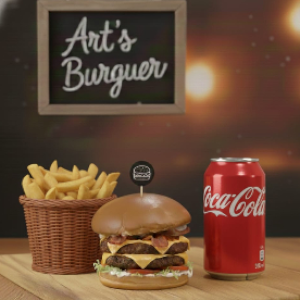 Art’s Double Bacon – Quem encara? Duas carnes artesanais de 150g (300g de pura suculência!) seladas na chapa, cobertas com quatro fatias de queijo cheddar derretendo e quatro fatias de bacon super crocante. Tudo isso abraçado por um pão brioche amanteigado, alface americana fresca, tomate e cebola roxa e nossa maionese de alho tradicional. Não é só um lanche, é uma experiência incrível! Acompanha 30g de Maionese Artesanal de Alho Tradicional + Batata Frita 100g (Foto: Batata meramente ilustrativa) + Refri Lata 350ml.